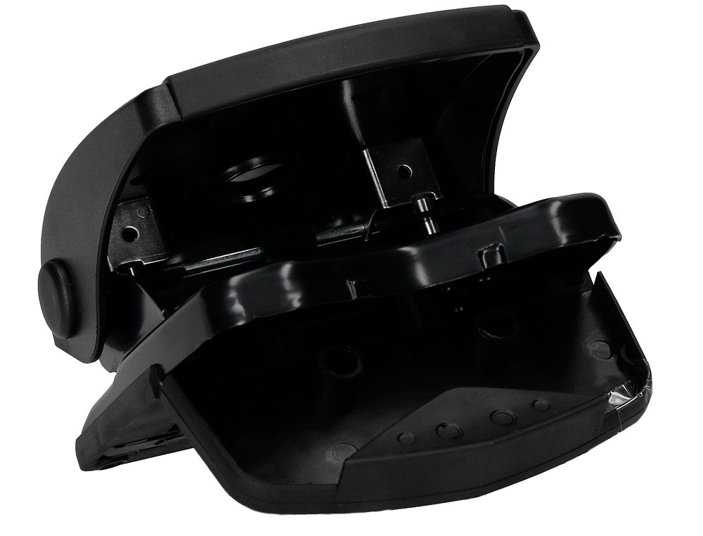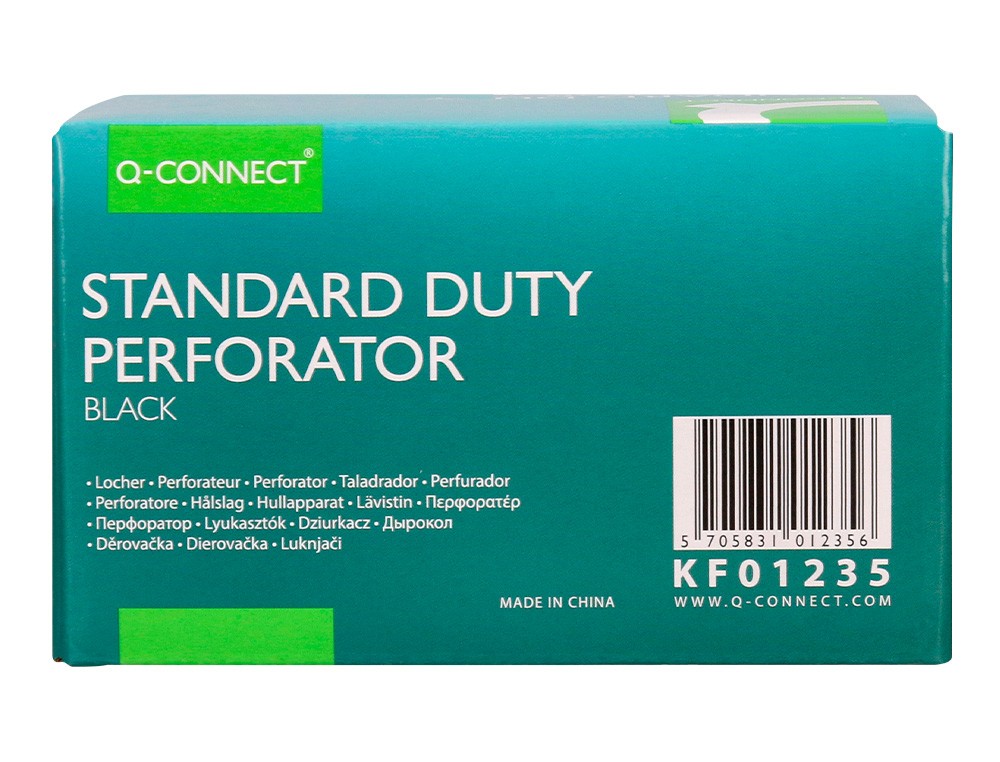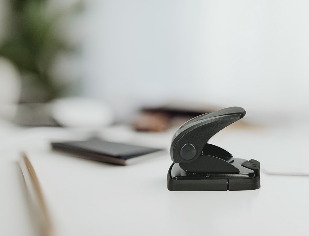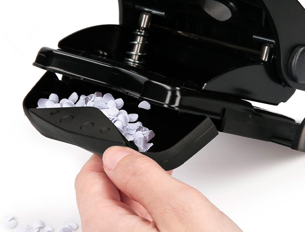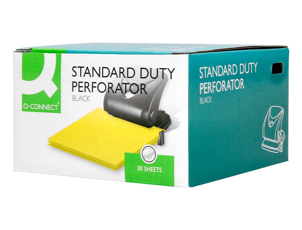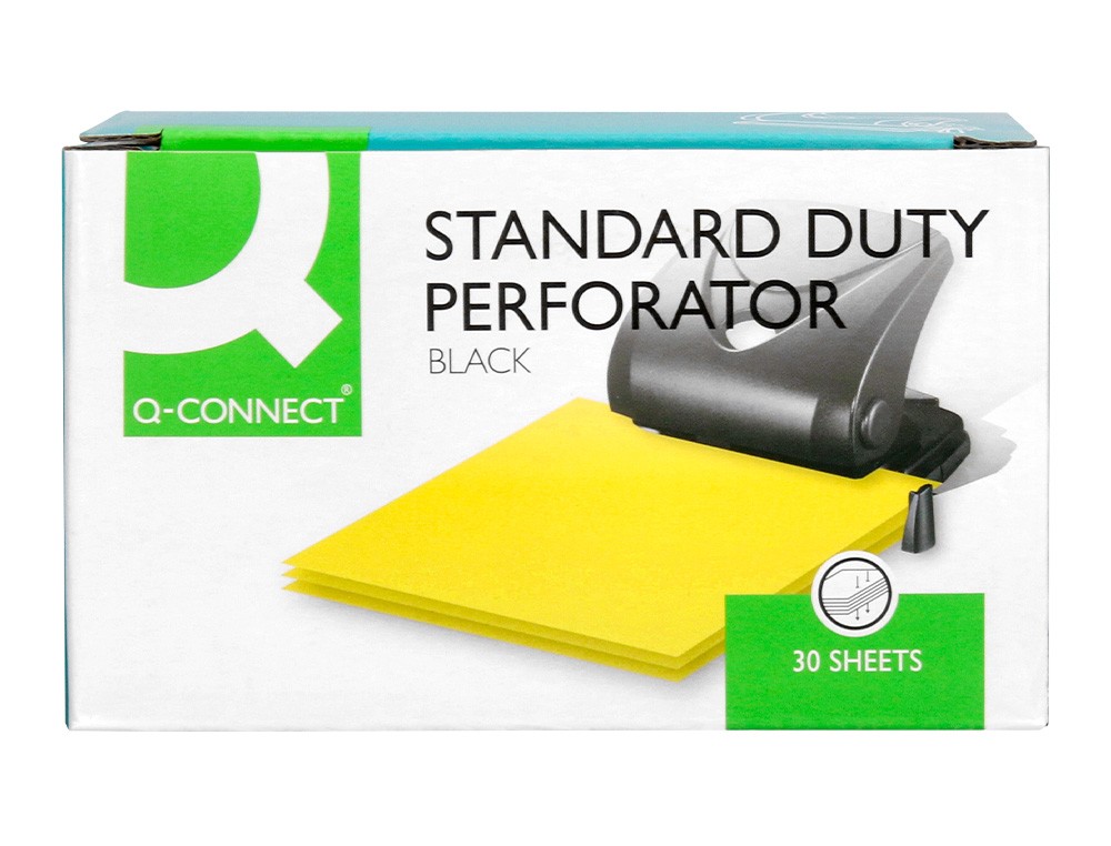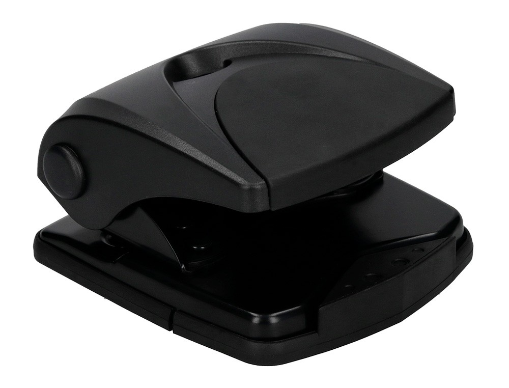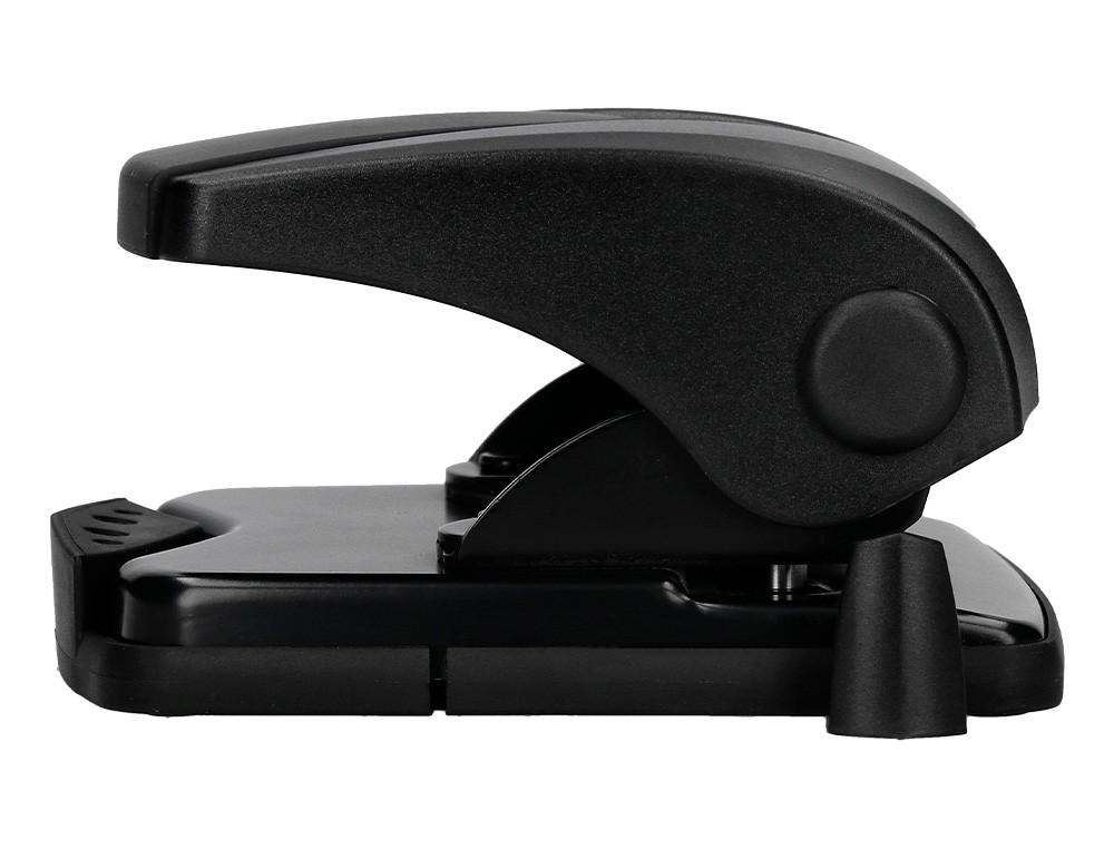 Parte superior de plástico y base metálica, con base antideslizante de plástico. Tiene regleta tope para alinear el papel. Con capacidad para taladrar 27 hojas. Abertura de 2,7 mm. Color negro. Medidas de la base: 110 x 120 mm.
