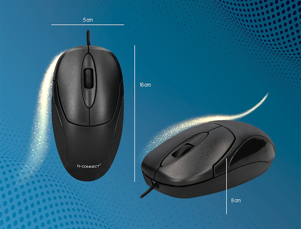 Ratón óptico de 3 botones. Funciona sobre cualquier superficie. Rueda con movimiento horizontal y vertical. 1,5 Ghz. Tecnología óptica de 800 DPI. Funciona en los puertos USB. Cable de 1,45 m.
