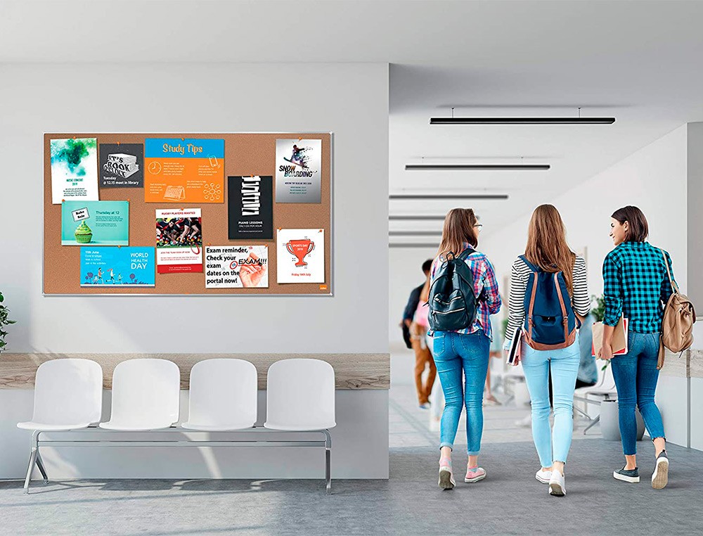 Tablero de anuncios de corcho de formato panorámico con un marco contemporáneo fino y discreto que ofrece una superficie de visualización más accesible y extensa. El sistema InvisaMount facilita la instalación y los soportes de sujeción están cuidadosamente ocultos tras el tablero. Tablero de anuncios con una excelente superficie de corcho para fijar y mostrar tus avisos. Medidas: 1550x870mm.